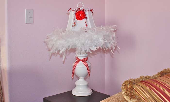 I switch lamps around in this house frequently. This is one I redid with a new shade and added feathers, some Christmas beads in clear, white and red and a red ribbon flower I made many years ago. I reuse a lot of stuff around here. I usually try to get the other decorations off with a heat gun but I was afraid I'd set the ribbons on fire this time so I bought a new lamp shade at Wal-Mart. I have taken things off with a heat gun but I'd never try it with feathers. They'd catch fire for sure.