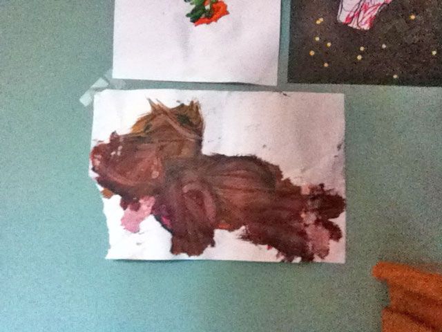 While we were over there in February we saw this painting done by the one who is almost 4. I was stunned that she could actually paint a dog. You DO realize it's a dog, right? I can't even draw a stick dog!! Her father and uncle are artists though so she's inheriting it from the other side of the family. Her dada can draw just about anything. I truly have never seen so much talent in a man—computer scientist, artist, handyman extraordinaire and a story teller with a fantastic imagination.