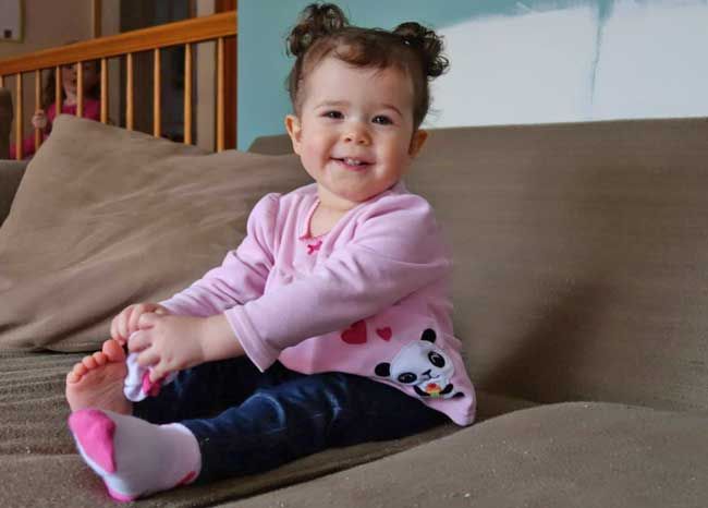 This is Miss J with her pony tails. Her hair is so curly it looks short but it's getting long. The white splotches on the wall are different paint colors they're testing. The blue was on the walls of the family room when they moved in but it's gonna go real soon! The whole house will be painted along with all the woodwork trim and cabinets but it'll take them a couple of years I know because of having little munchkins around.