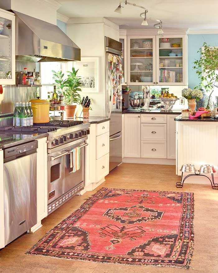 I find this kitchen divine. I like how they have an antique rug in the kitchen. I wish more people put rugs in their kitchen. I have rugs over my vinyl to soften my kitchen. It's a small kitchen but adequate for our needs...if we eat out 3 times a week! Notice the doggie bowls are higher than normal so as to help the dog not to have to bend over as much.