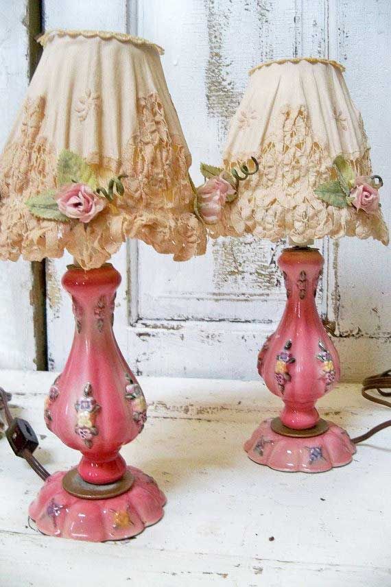 A pair of antique lamps made beautiful with stunning lampshades some one has froufrou-ed up.
