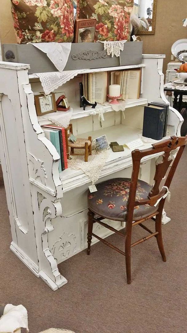 A lovely little vignette in an antique store. It looks to me like a piano converted into a home office space.