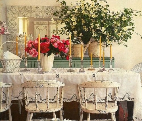 Look how this homeowner has made the dining room so cute with these old barrel chairs painted white and shabby-ed up a bit. Then the gorgeous display of roses on the table and the huge plant on the credenza with a huge mirror. This is a lovely room.