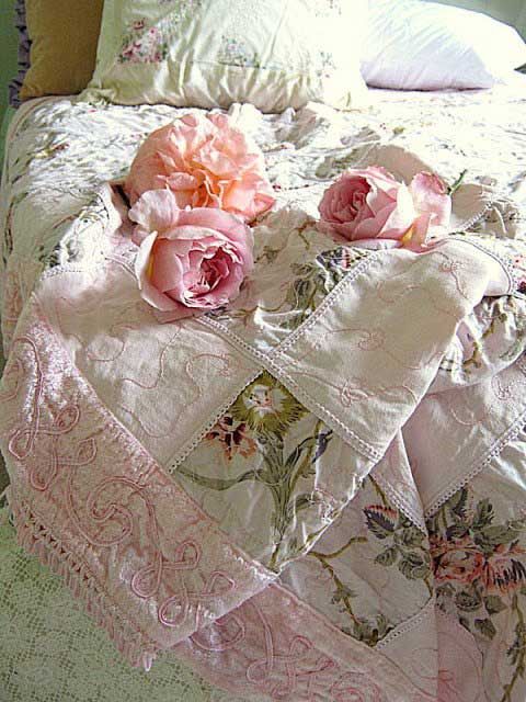 Beautiful bedding and roses on top.