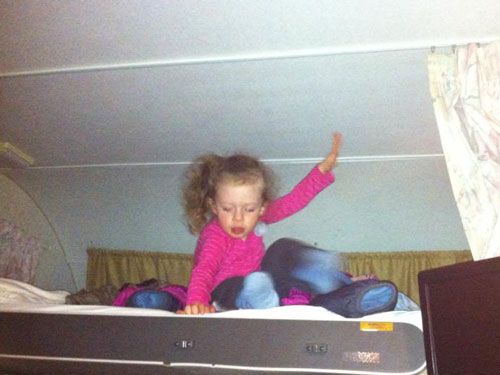 Miss Juliette is a sweet-tempered angel who will be one year old at Thanksgiving. Her dark hair is curling now like her sister's hair, Miss Caroline. Here are the two of them on a recent camping trip with my daughter—their grandmother and the girls' parents in our daughter's RV. They were all up in Washington at a camp park.
