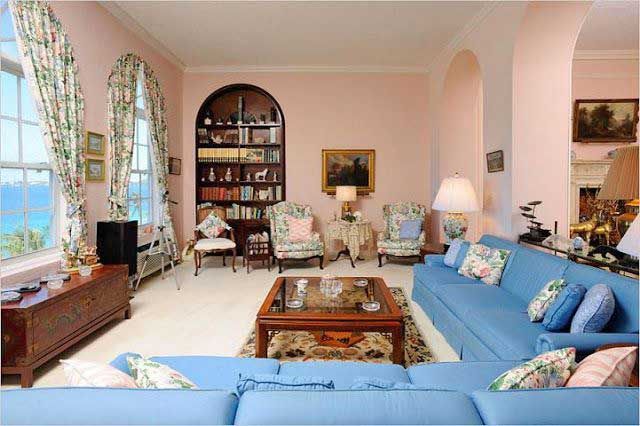 Just a beautiful room facing water. Lots of seating, pink walls and the blue of the water in the sofas.
