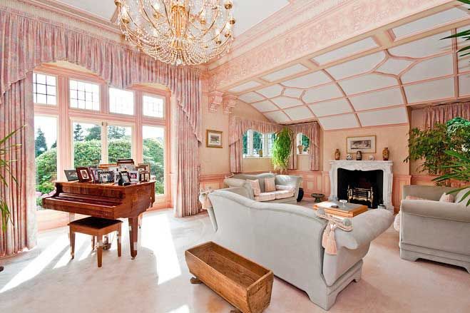 Pink walls trimmed with white or paler pink (hard to tell from this photo) and lush gold-colored sofas and touches of gold throughout. Another favorite of mine.