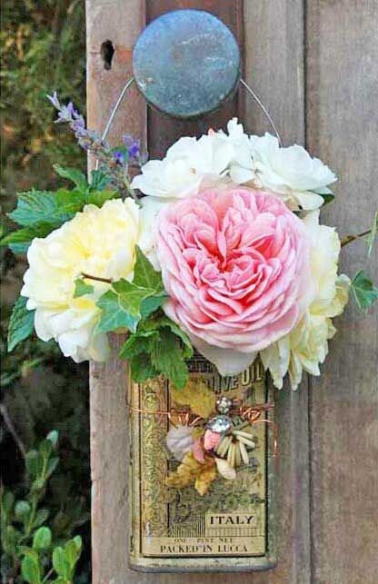 A small sweet bouquet of roses hanging on an old door in a garden. Magnificent!