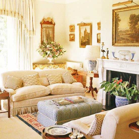 More of the Shabby Chic look. I especially like the square ottoman with a white ruffled cover. Darling.
